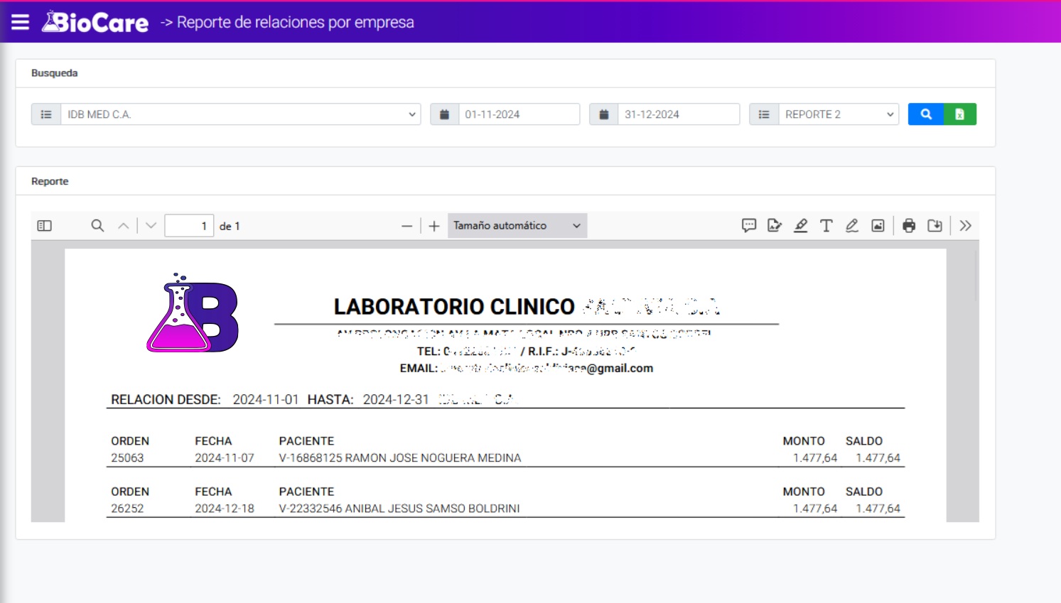 Su Laboratorio Clínico cuenta con el sistema Biocare desde hace 1 año, nos ha facilitado el reporte de resultados, así como los datos estadísticos de pacientes y cada prueba, es de fácil manejo y se puede adaptar a los cambios que ha requerido el reporte de cada examen. Los pacientes quedan satisfechos al recibir los resultados de forma digital, brindandoles mayor comodidad, a los médicos les ha permitido abordar de forma inmediata la Clínica del paciente. Biocare es una opción viable para cualquier laboratorio, lo recomiendo ampliamente.